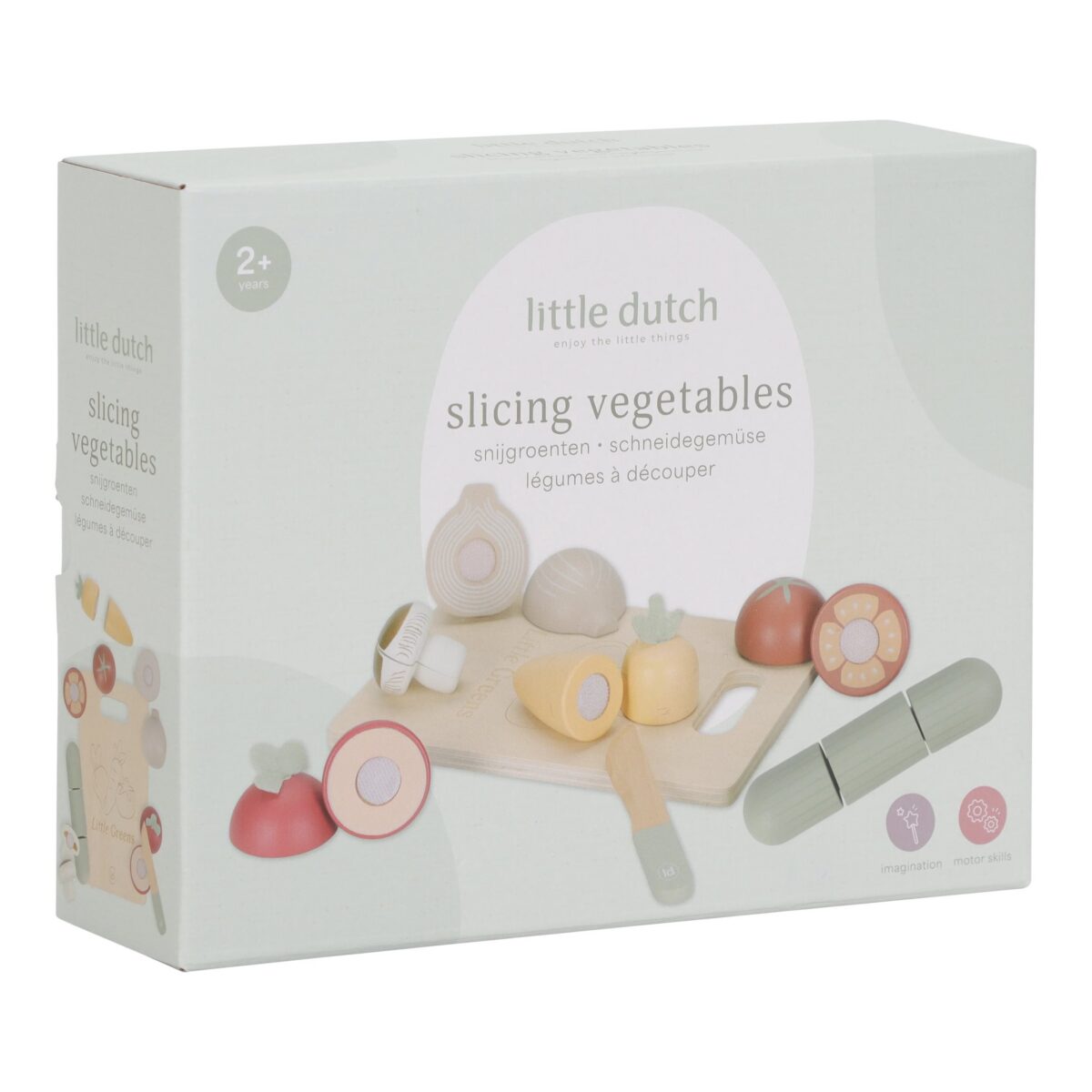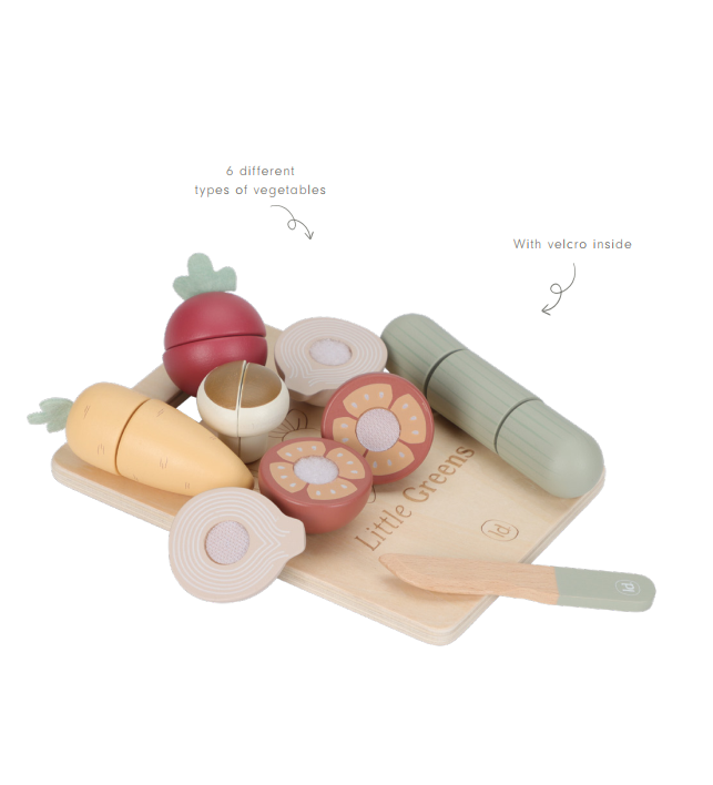Krõmpsuta maitsvaid köögivilju! See Little Dutch´i puidust köögiviljade komplekt on mänguline viis oma lapse rollimängu stimuleerimiseks. Söögi valmistamine koos on ju palju lõbusam. Viiluta puidust noaga lõikelaual oma köögiviljad ja oledki juba väike tippkokk! Kõik köögiviljad saab jagada kaheks osaks ja uuesti krõpskinnituse abil kokku panna. Täiuslik rollimänguks mänguköögis ning lõbus viis tervisliku toitumise tundmaõppimiseks. Mis on täna menüüs?