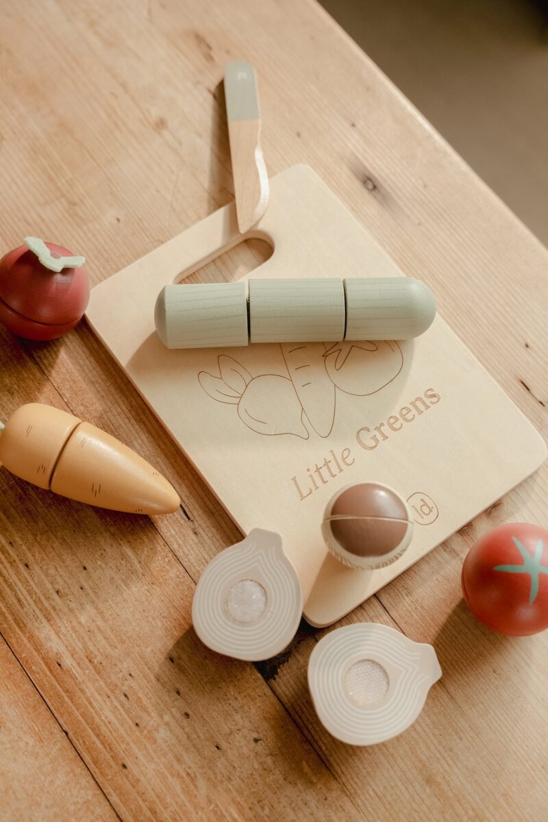- Komplekti kuulub 8 asja: sibul, tomat, seen, peet, kurk, porgand, puidust mängunuga, puidust lõikelaud