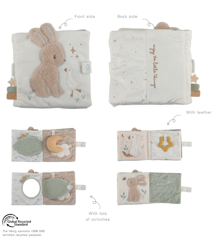 See Little Dutch´i värviline “puutu-ja-tunne” mänguraamat peidab endas armast jänkut ja hanekest. Beebid naudivad erinevate lehekülgede avastamist, kuna raamatuke sisaldab kõristit, peeglikest ja heli tekitavaid asju. Samuti palju erinevaid materjale ja tekstuure. Erinevad vahvad pildid ja elemendid mänguraamatu lehekülgedel hoiavad Sinu last tegevuses – ideaalne reisikaaslane. See mänguasi ei stimuleeri ainult meeli, vaid on ka ideaalne arendamaks Sinu lapse käte-silmade koordinatsiooni. Selle tegevusraamatuga ei hakka kunagi igav!