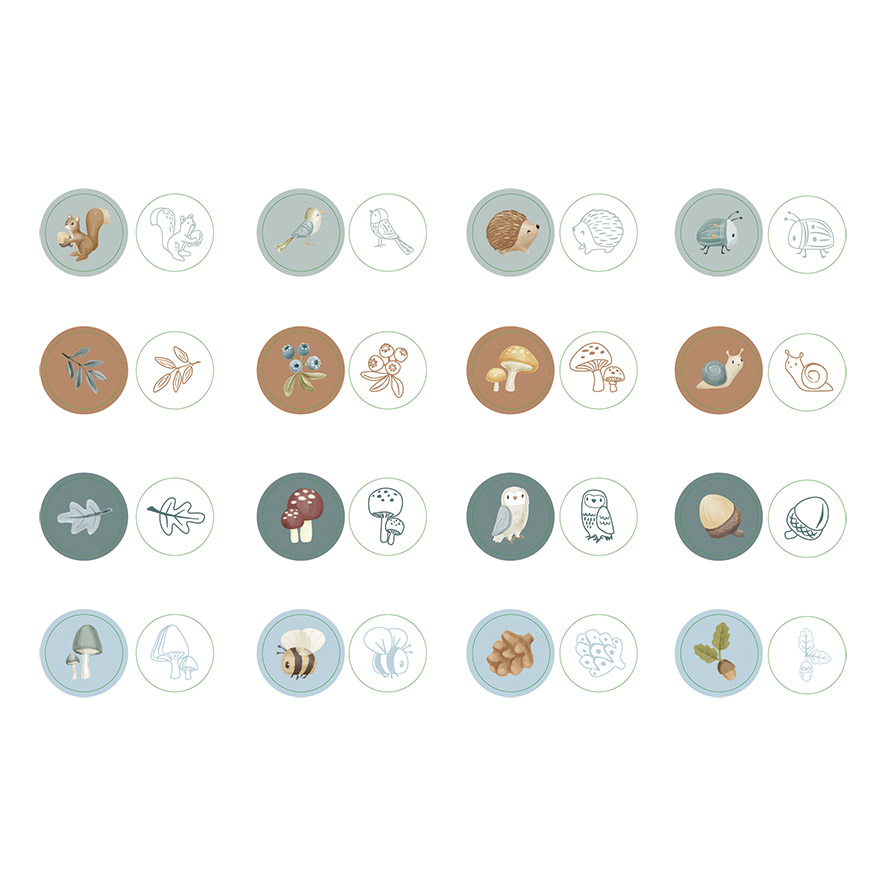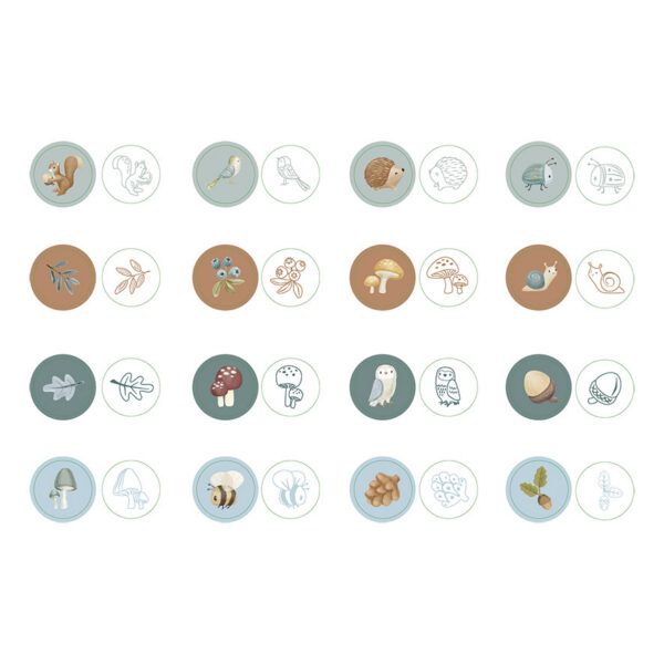 Laske oma väikesel nende ´Forest Friends´ kollektsiooni templite abil põnevaid metsaseiklusi luua. See Little Dutch´i templite komplekt sisaldab 16 erinevat templit, sealhulgas armsaid metsloomi nagu öökull, siil ja rebane, aga ka mustikaid, seeni ja mesilast. Templid on isemärguvad, seega pole vaja lahtist tinti – lihtne ja kohe kasutusvalmis! Lõbus ja lihtne viis laste loovuse stimuleerimiseks arendades samal ajal ka nende peenmotoorikat.