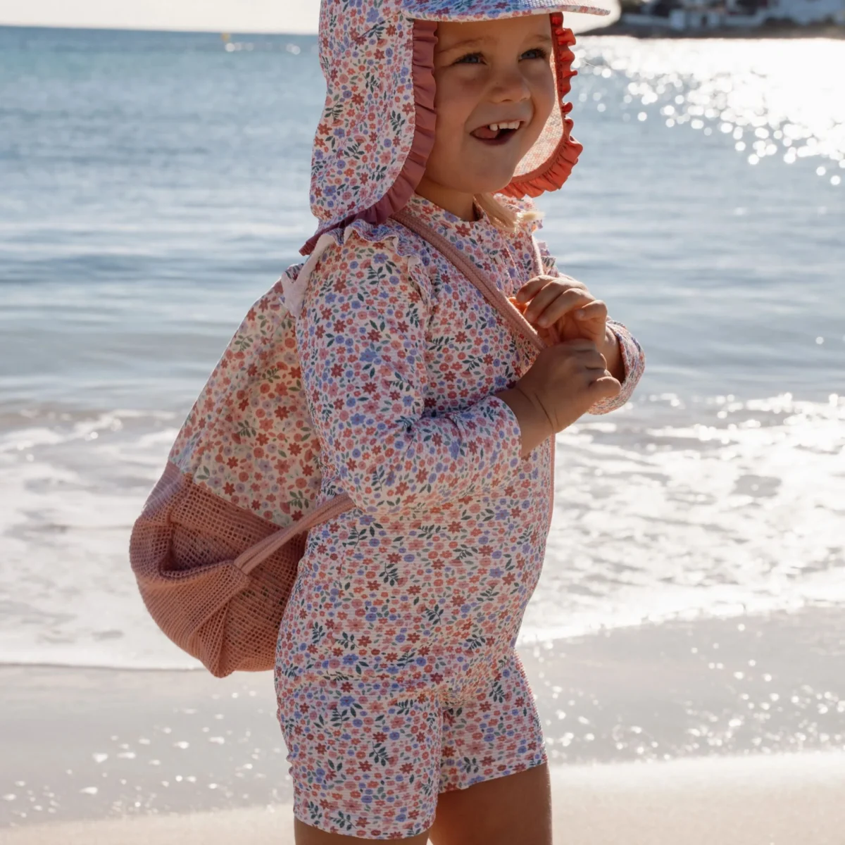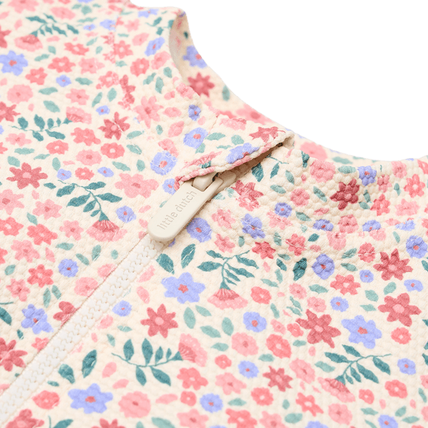 Ujumine lillemeres? Little Dutch´i roosa pikkade varrukatega ujumiskostüüm Dreamy Flowerfield on suvine lemmik, mis on täis võlu. Hele taust koos õrnade lillemustritega loob värske ja pehme välimuse, mis paistab silma – esimesest veepiisast kuni viimase päikesekiireni. Pehmest vahvelkangast valmistatud mugav ujumiskostüüm tundub nahal õrn ja meeldiv. Õlgadel olevad volangid lisavad armsa detaili, samal ajal kui pikad varrukad ja UPF40+ kaitse aitavad päikese eest kaitsta. Tänu pikale lukule on seda lihtne selga panna ja ära võtta – isegi pärast pikka veemängude päeva.