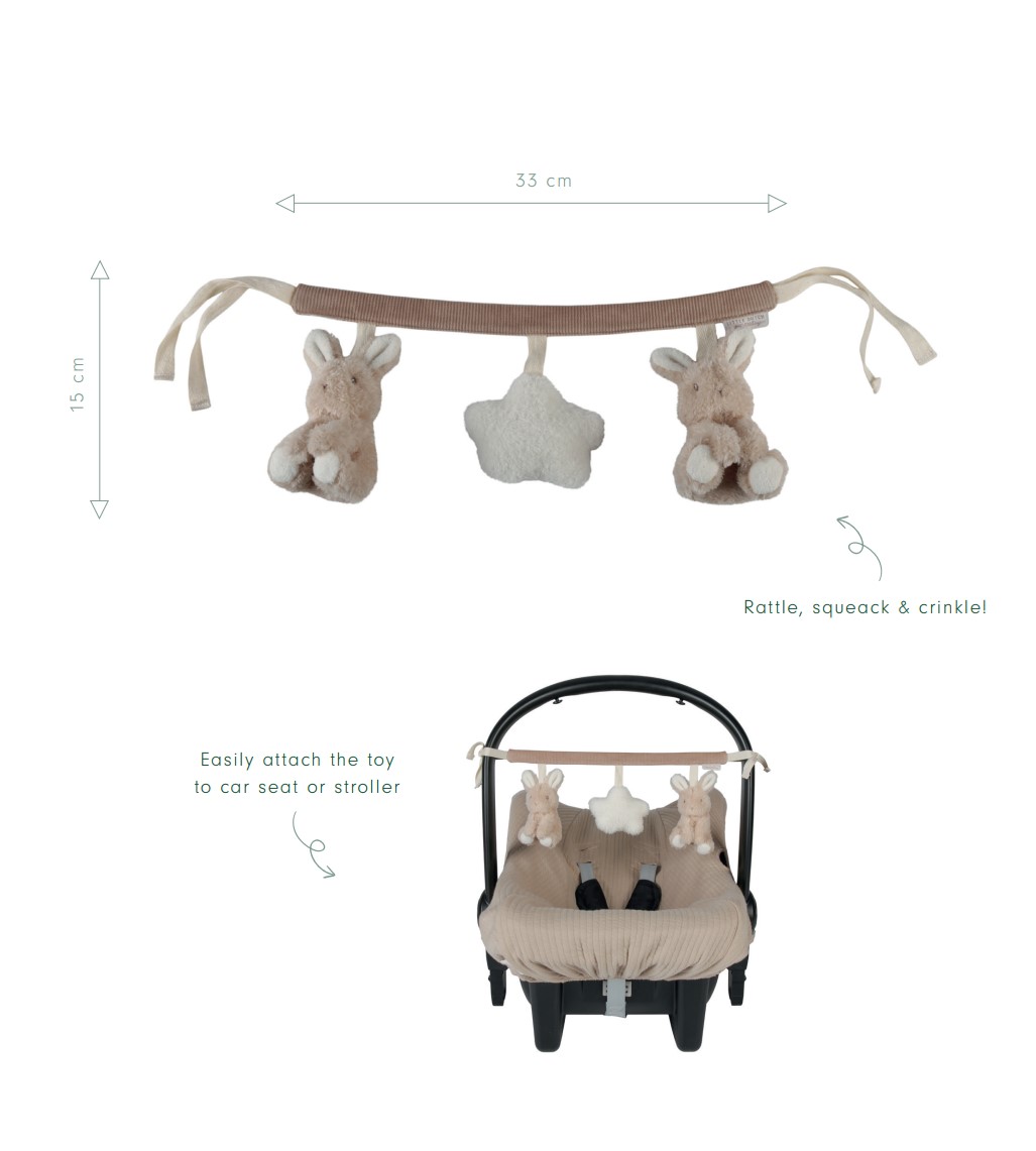 Seda Little Dutch´i mänguasjade ketti on lihtne kinnitada vankri, käru või auto turvatooli külge. Mänguasjade kett pakub rohkelt rõõmu ja meelelahutust Teie lapsele tänu kõristile ja heli tekitavatele mänguasjadele. Kaks armast jänkukest ja pilveke köidavad koheselt teie lapse tähelepanu. Samuti arendab see käte-silmade koordinatsiooni.